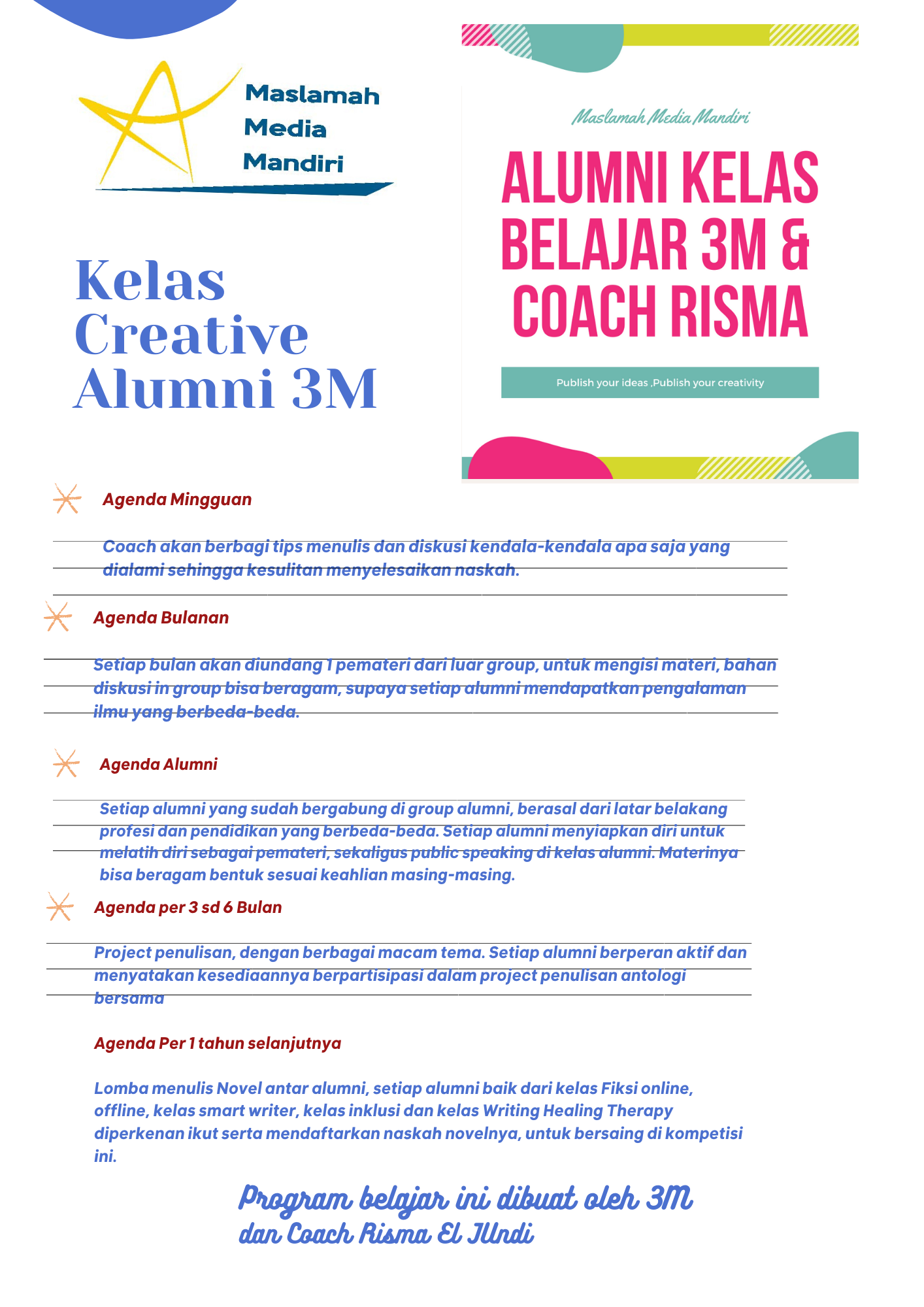 3M Writer Community merupakan gabungan dari seluruh alumni yang pernah belajar di kelas menulis bersama coach Risma El Jundi dan coach Aida MA. Keseluruhan alumni ini tergabung dari Kelas Fiksi, Kelas Inklusi, Kelas Smart Writer, Kelas Writing Healing Therapy.